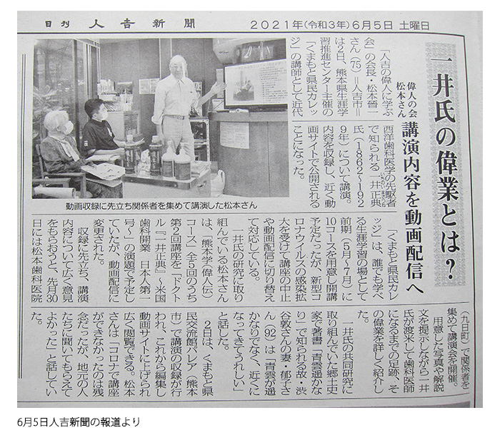 一井正典生誕150周年を迎える。地元人吉市や熊本市、大阪市及び米国(9月サンノゼ市、9月フィラデルフィア市)にて各種の生誕記念行事開催。150周年記念誌「維新の若きサムライ、一井正典とその時代」の刊行(熊本県歯科医師会)、記念講談会(宝井琴調氏)、「じゅぐりっと日米を駆けた一井正典展」(人吉城歴史館)、第65回九州歯科医学大会(10月熊本市)及び第22回日本歯科医学会総会にて「“歯科を志ざす”一井正典とその時代」(11月大阪市)の各ポスター展示が行われた。
